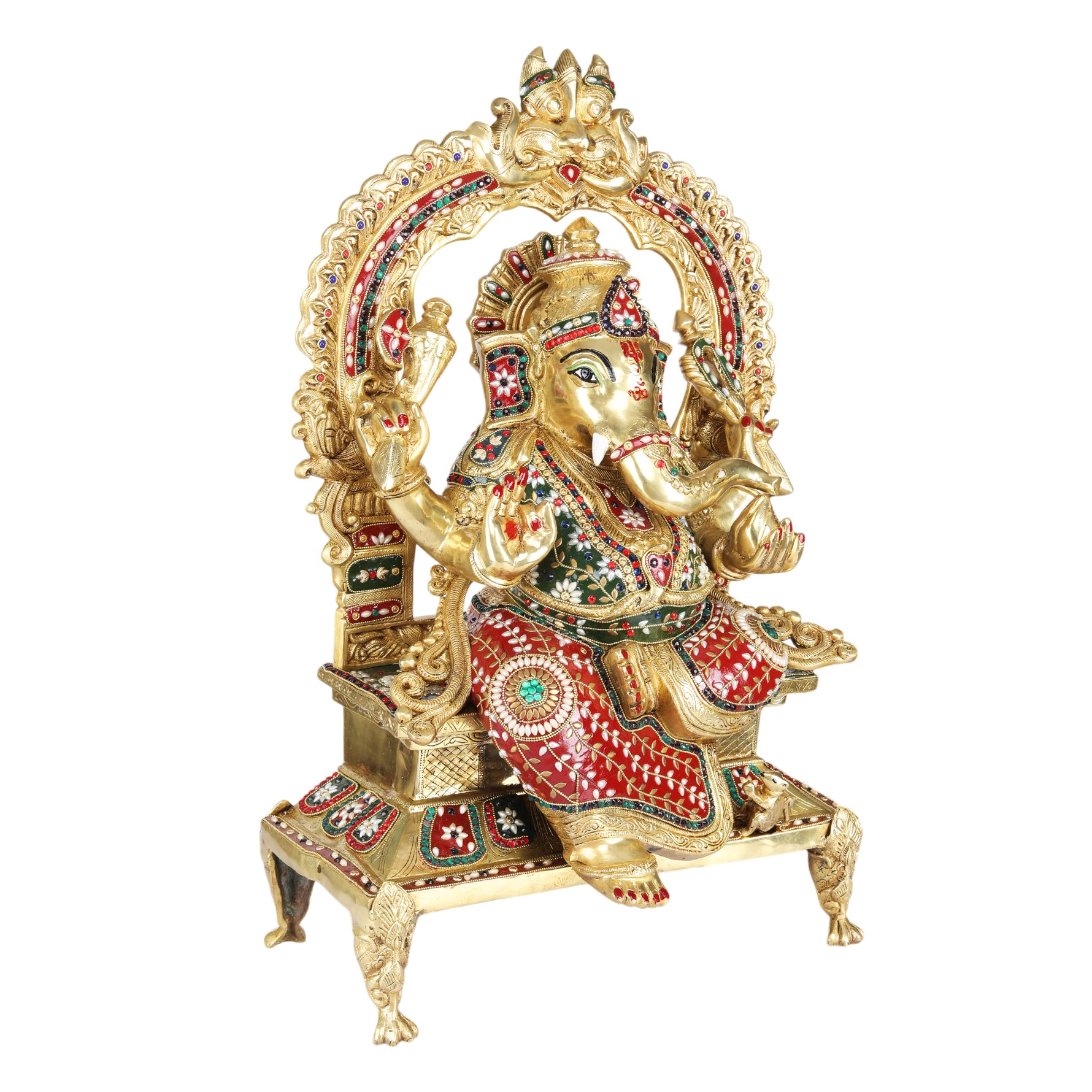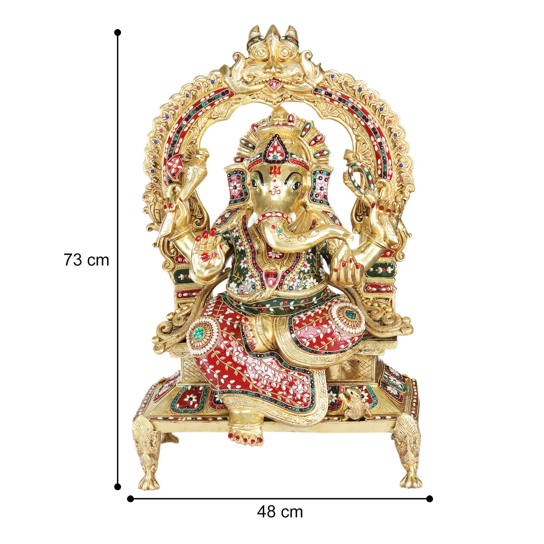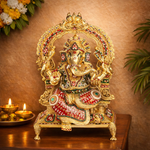 Is Ganesh murti me Bhagwan Ganesha ko shubh aashirwad mudra me dikhaya gaya hai, jo sukh, samriddhi aur safalta ka prateek maane jaate hain. Unki detailed crown design, jewellery work, aur colorful meenakari finishing murti ko ek rich aur divine look deti hai. Throne style seating aur decorative arch structure is idol ko aur bhi royal aur eye-catching banata hai, jo kisi bhi pooja room ya interior space ko instantly enhance kar deta hai.