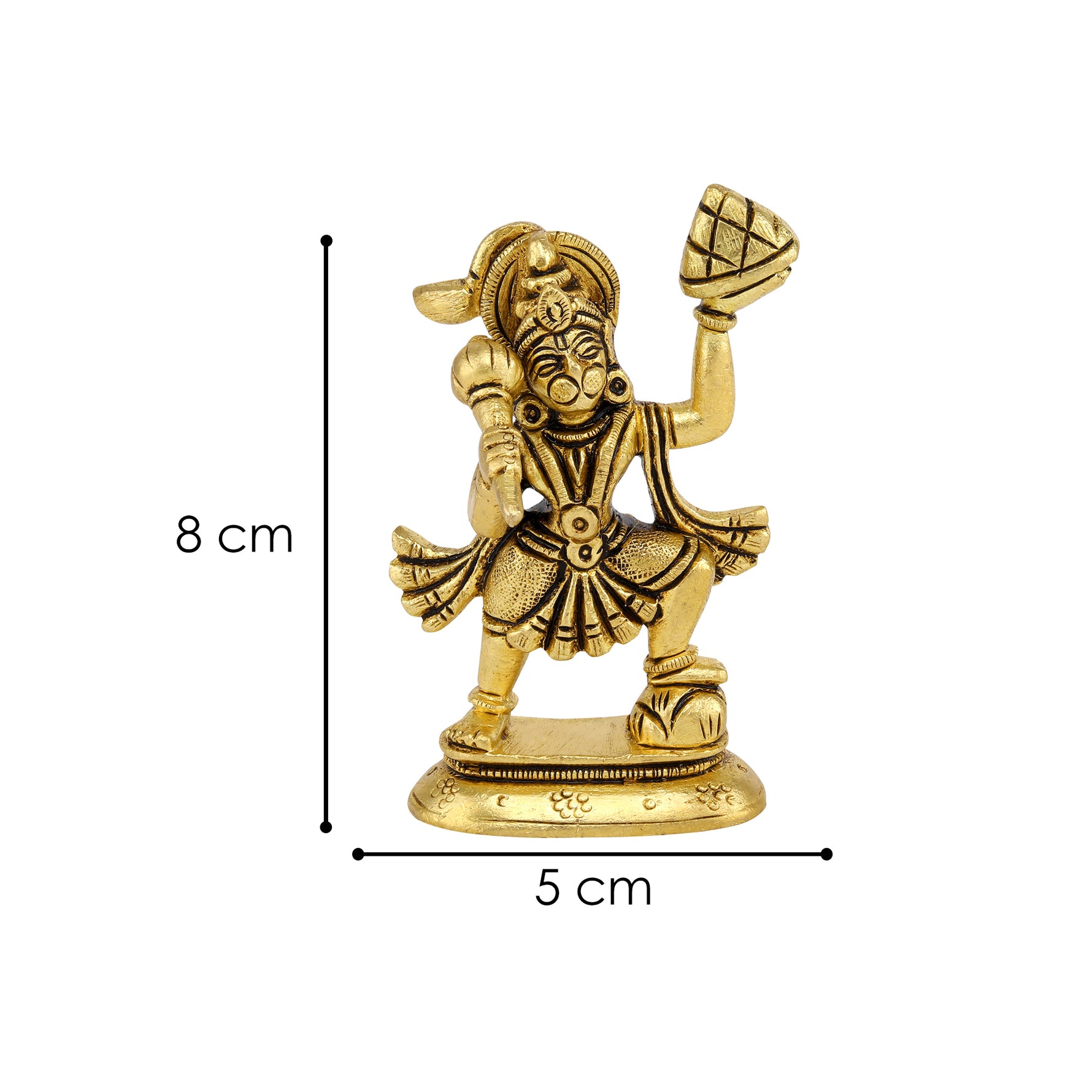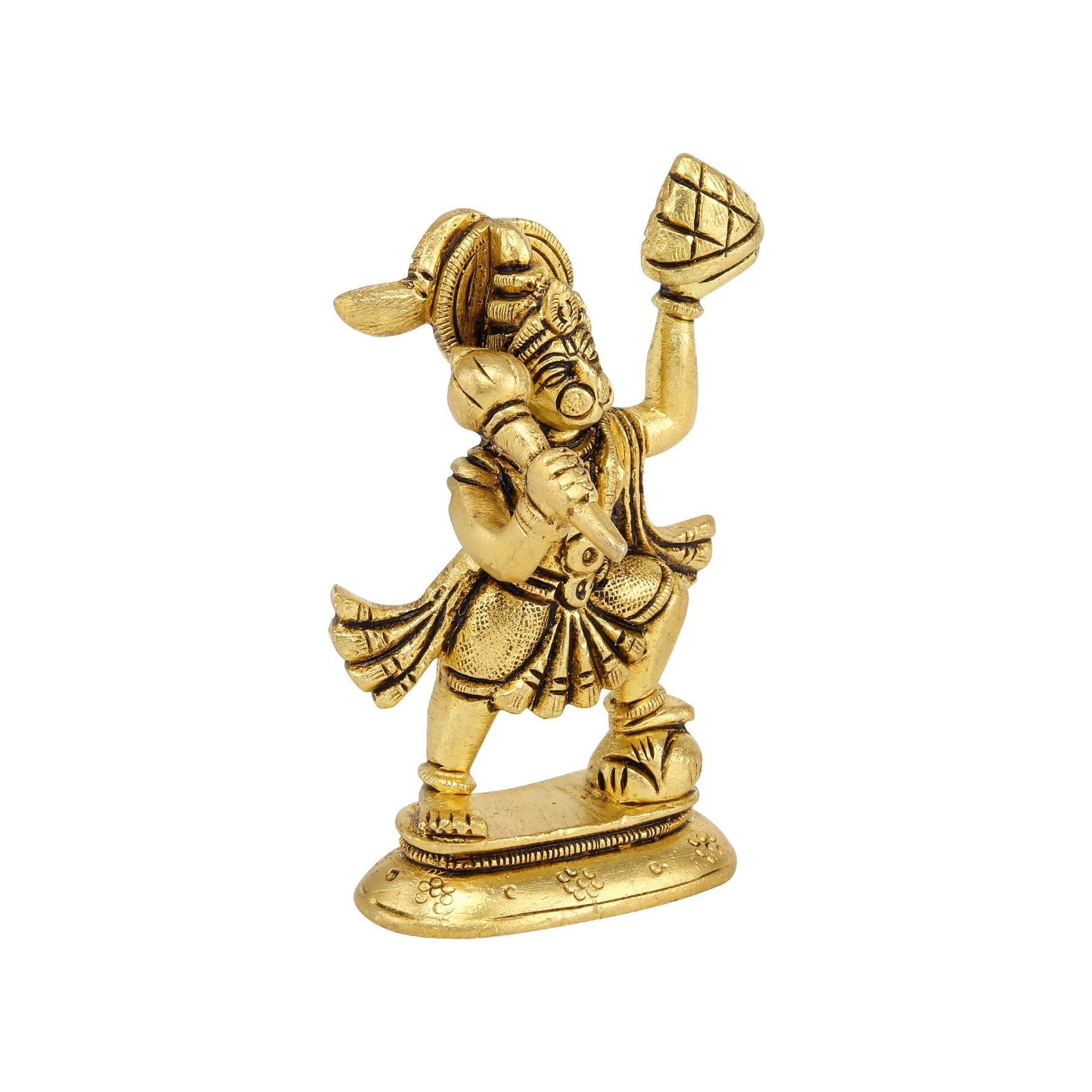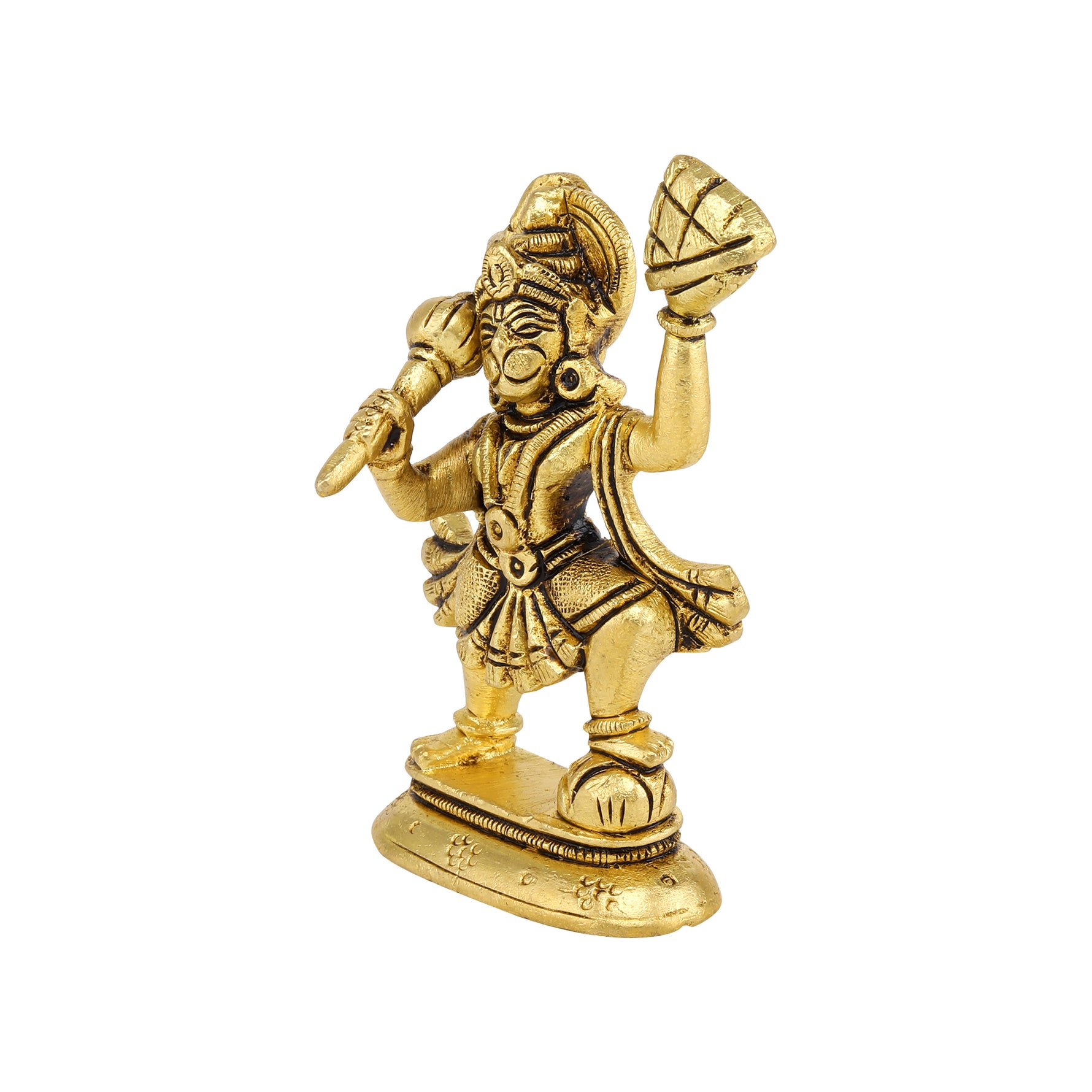 Featuring intricate clothing, decorations, and fine craftsmanship, this brass Hanuman idol by Shreeyaash features Sanjeevani.