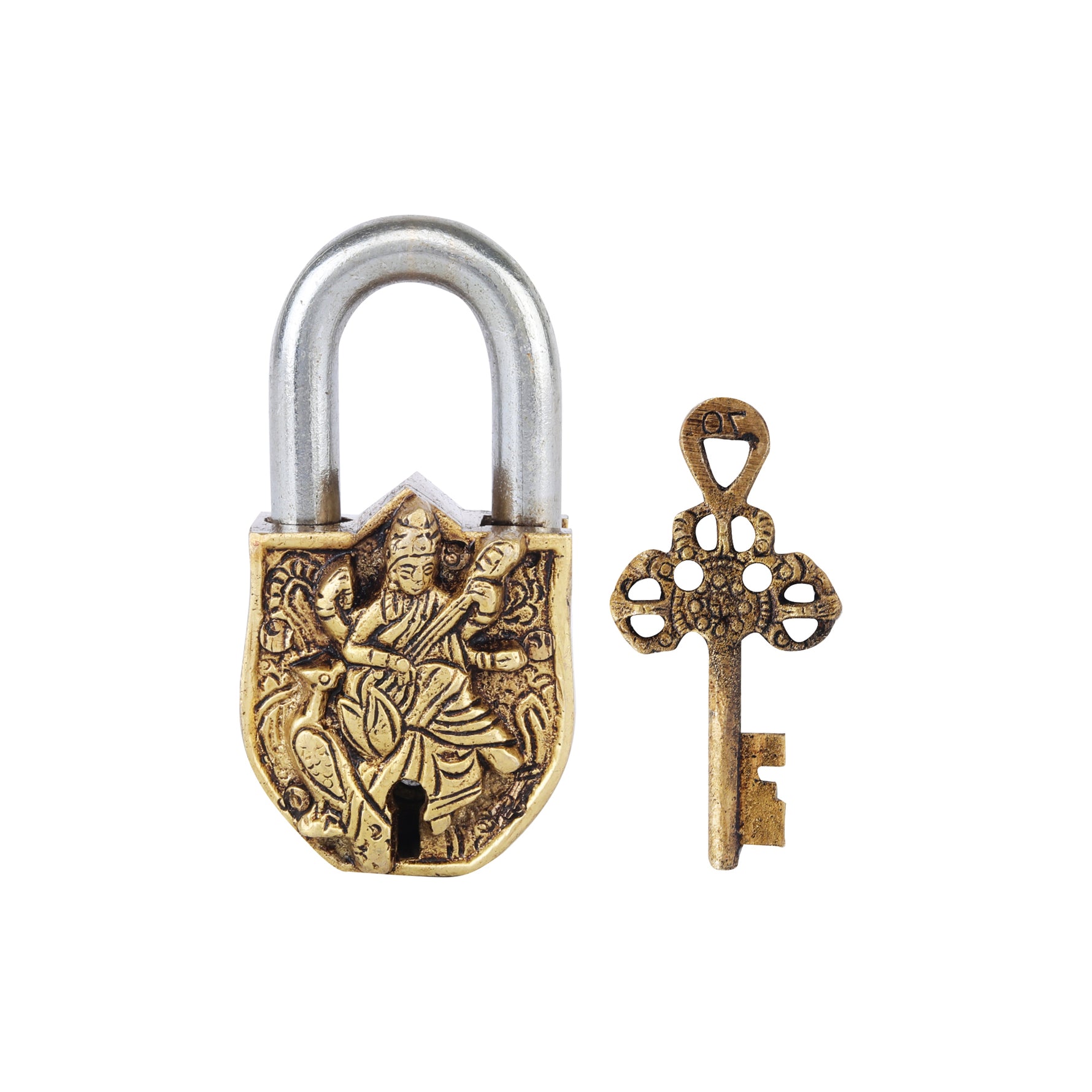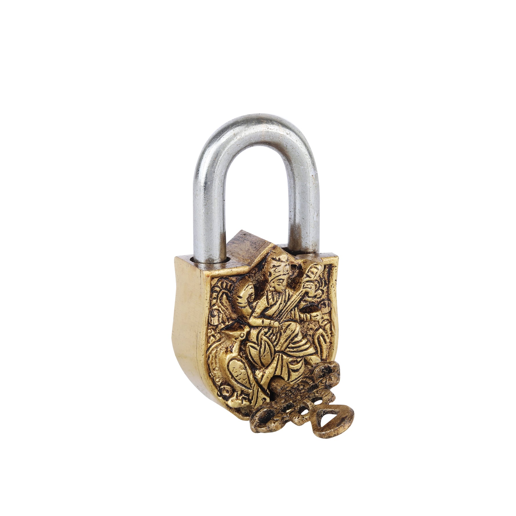 Introducing this distinguished Brass Saraswati Lock by ShreeYaash, meticulously cast from 100% pure brass with authentic craftsmanship. This ornamental lock celebrates the goddess of wisdom, knowledge, and intellectual pursuits, making it a refined choice for discerning collectors. The detailed brass construction demonstrates superior artisanal quality, blending spiritual reverence with functional design.