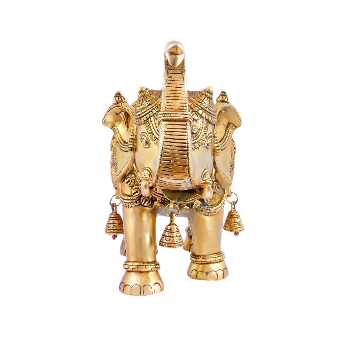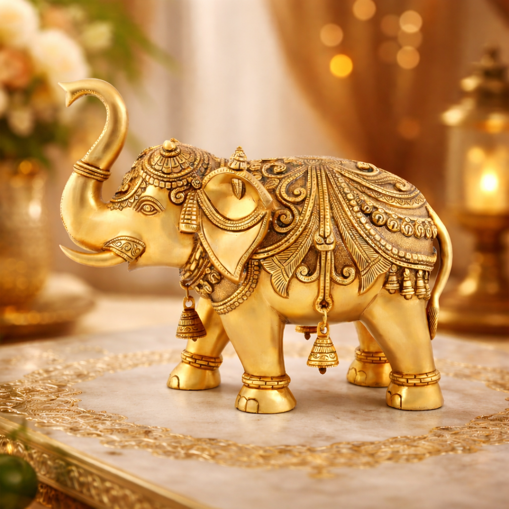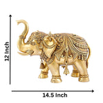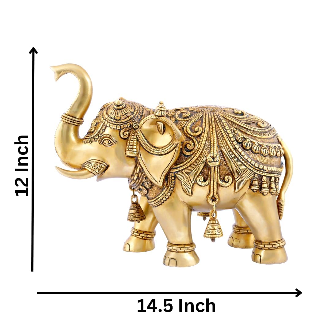 The statue features a majestic elephant with its trunk raised upward, which is widely believed to attract good luck, wealth, and positive energy into the home. The detailed craftsmanship highlights the artisan's dedication and skill. Each part of the elephant, from the decorative saddle to the intricate carvings and hanging bells, is carefully designed to create a luxurious and traditional appearance. The antique gold finish enhances the overall beauty of the statue and gives it a premium and timeless look.